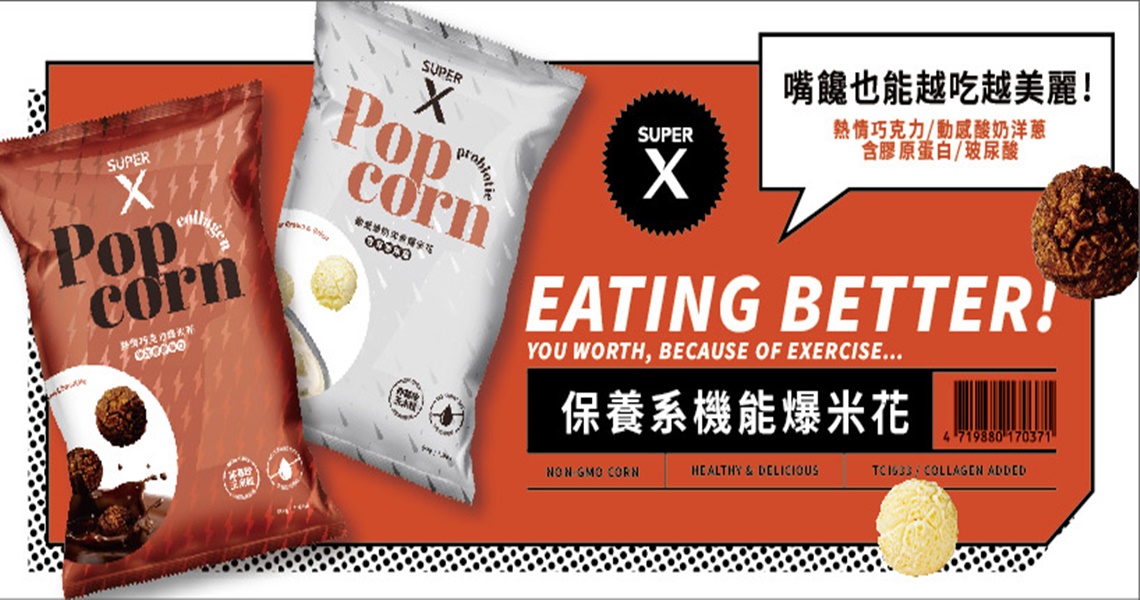 大江生醫(8436)子公司-大江生活旗下全新運動營養品牌Super X希望傳達「享受運動、打造專屬於自己的健康宣言和時尚生活態度」理念,研發一系列 運動x保養x健康 的機能性食品。本季率先推出兩種獨特風味的保養系機能爆米花,攻佔機能食品市場。