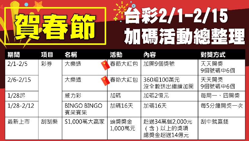 同時,2月1日至2月5日「大樂透」每期會加開9個獎號,只要對中9個獎號中任6個即為對中春節大紅包獎項,每組獎金100萬元,由該組所有中獎注數均分。