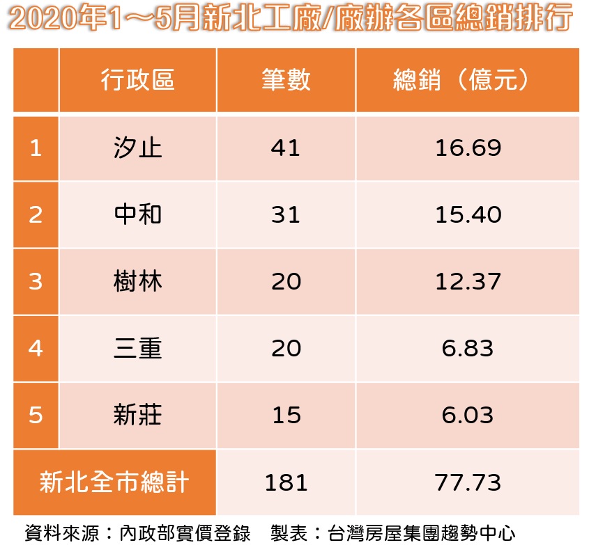台灣房屋趨勢中心觀察今年1~5月新北市各區的工廠廠辦交易量,其中以汐止交易筆數最多達41筆,累積銷售金額為16.7億元;其次為中和31筆,永和20筆,也都超過10億元,新北市今年累積廠辦總銷達77.7億元。