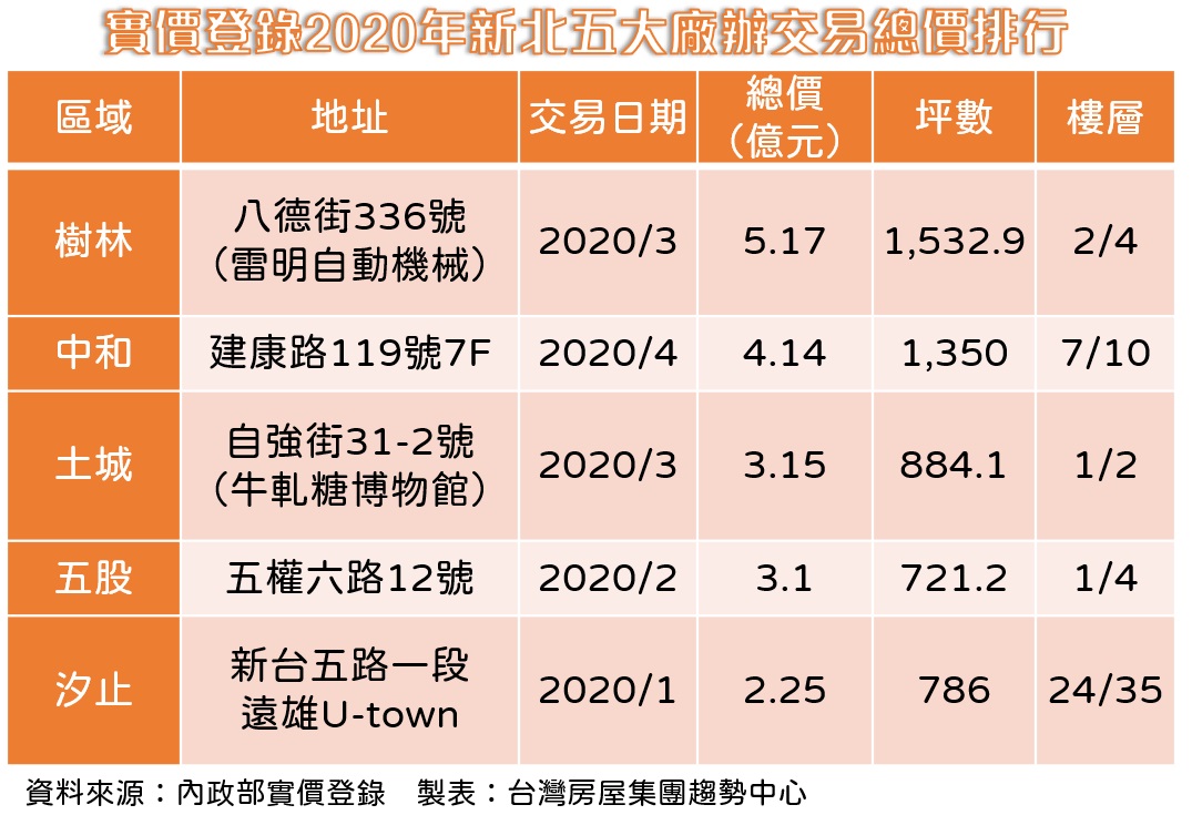 觀察實價登錄今年廠辦最高總價交易為樹林八德街4層樓,共1,532.9坪的工廠,買家松增股份有限公司以5億1,680萬元買下;第2名為磐儀科技,以5億1,445萬元買下中和建康路1,350坪廠辦;第3名則是土城牛軋糖博物館,買方為桓達科技。