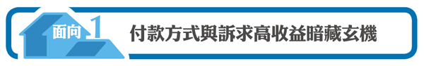 付款方式牽涉到付款金額的調度,是消費者最關心的一環。一般來說,預售屋的付款方式分為「訂金、簽約金、開工款、工程款、交屋款」等階段,但以下4種與款項有關的行銷話術要特別留意。另外,針對投資客的收益訴求,也有眉角要注意。