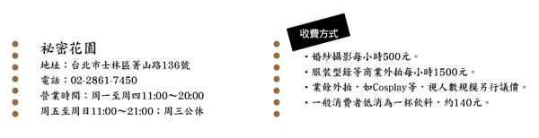 祕密花園的前方正是陽明山菁山里衛星群(中華電信衛星通信中心),雖然它就緊臨著菁山路邊,卻因地處幽僻山牆之後,隱藏於樹林坡道之間,若非熟門熟路,並不易發現這兒有一家僻靜的咖啡館,可說是名符其實的「祕密花園」。