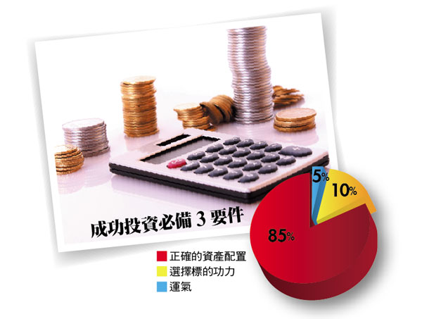 上班族可以花在投資上的時間非常有限,因此,朱敬瑜建議在這麼短的時間內就要把精力放在最重要的事情上,那就是做好資產配置。以她多年的經驗觀察,一個成功的投資,八五%歸功於正確的資產配置,一○%來自選擇標的的功力,剩下的五%就要靠運氣。