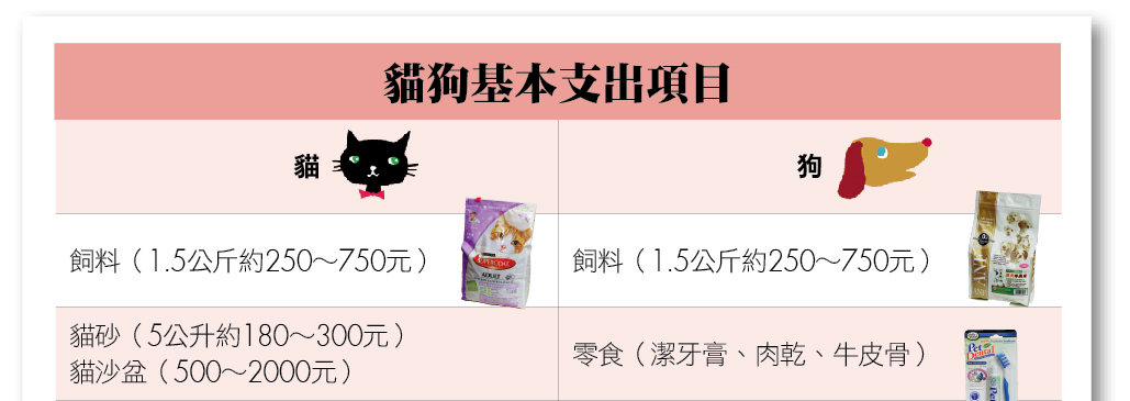根據創市際市場研究顧問有限公司在二○一○年一月的「寵物開銷」調查顯示,有五成五受訪者表示目前有養寵物,其中,受訪者平均一個月為寵物花費的金額在「五百元以下」者(三九‧六%)占最多數,其次分別為「五百至一千元」(二九‧二%)、「一千至一千五百元」(一七‧四%),花費一千五百元以上的受訪者也有一三‧七%。