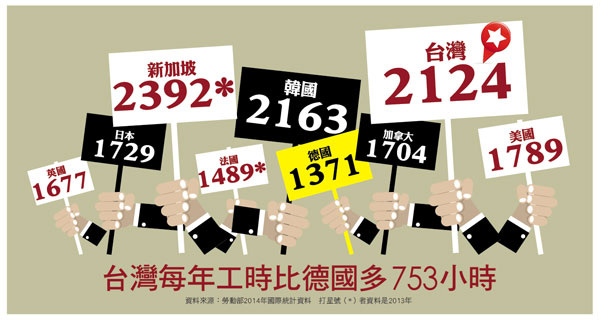 若與德國相較,以每日工作8小時計算,台灣人較德國人1年多工作了3個月,其中以服務業平均工時過長的比例最高。