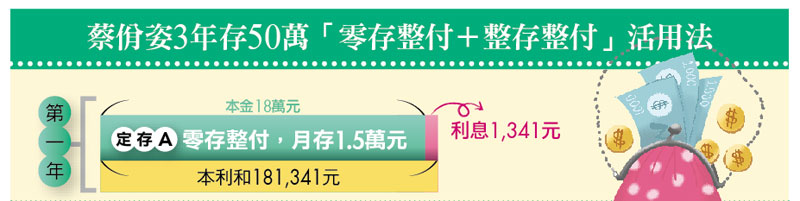 「當第一年的『零存整付』到期後,第二年起,我就把這筆錢再用『整存整付』方式繼續孳息,最大的好處是能避免不小心把錢花掉,同時,第二年我還是會繼續做『零存整付』的儲蓄動作。」