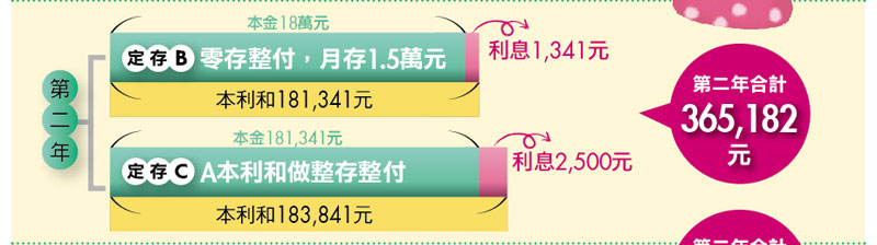 接著,第二個步驟用「整存整付」搭配「零存整付」來達到持續儲蓄、守住存款和賺取利息的三重目的。
