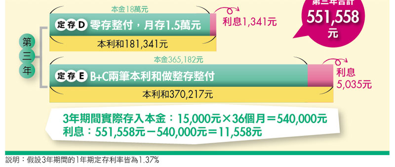 「到了第二年的年底,我就有兩筆定存到期,一個是當年度的『零存整付』,一個是第一年轉入『整存整付』的存款;等到第三年開始,我就把兩筆錢合起來再用「整存整付」方式孳息,同時一樣繼續做『零存整付』,所以第三年的年底,我就存了五十五萬多元,用定存儲蓄真的很簡單,不是嗎?」