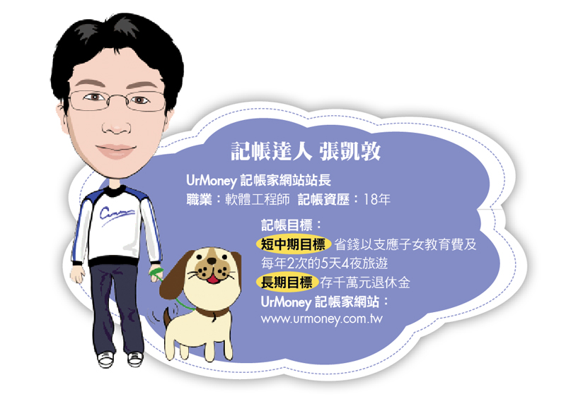 實在很難想像,一個大男人從大三時就開始記帳,而且一記就記了十八年,從未間斷。記帳讓UrMoney網站站長張凱敦達到以下目標:剛開始工作時為自己買輛汽車代步;工作兩年後存到結婚及購屋裝潢費用;結婚後兩年內還完房貸一百多萬元;以及有了兩個小孩後,除了支應子女教養金,還能保持每年全家兩次五天四夜旅遊的快樂時光;同時間,他並持續定期定額投資,希望在二○二五年時能存到千萬元退休金。到底,他是如何開始記帳而且成功的?