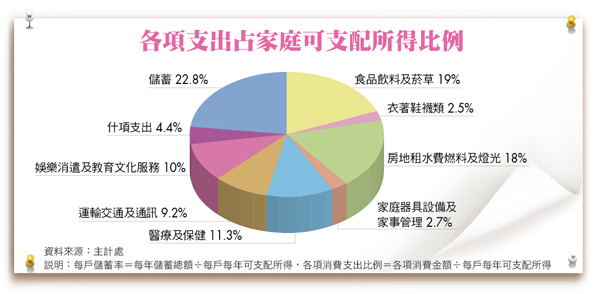 在各項消費支出中,食品、飲料及菸草費,以及房租、水電等兩大類支出所占比重各約兩成,醫療保健占約一成,交通通訊、娛樂教育合計占約兩成比重。投資美人不妨拿出自己的消費支出來相互對照,看看哪一方面的開銷超支太多?譬如,伙食費如果高達可支配所得的四成,代表很有改善的空間,應該想辦法降低消費的金額。