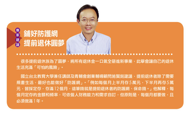 「人因為有夢想而偉大,但也要吃飯才會長大。」國立台北教育大學兼任講師及青輔會創業輔導顧問施賢銘指出,如何在圓夢與現實間尋求平衡,是提前退休者的最大挑戰。不少人因為太過理想化,反而讓退休生活蒙上陰影。