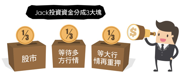 目前Jack把可動用資金分成3大塊:三分之一放股市、三分之一等待多方行情,剩下三分之一等大行情再重押,主要標的以外匯保證金、股市現貨、台股選擇權、海外期貨指數、海外期貨選擇權為主。