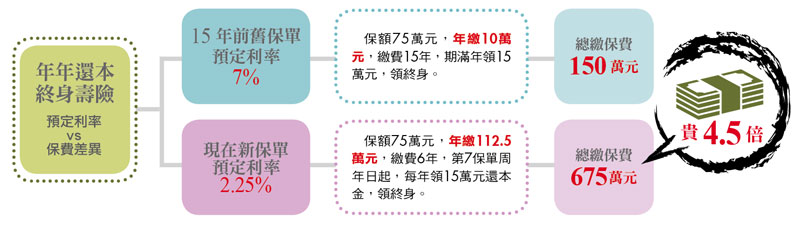 舉例來說,莉文十五年前買的還本終身壽險預定利率高達七%,現在市面上熱賣上百億元的台幣年年還本終身壽險保單預定利率,大約只有二‧二五%,就會出現曉莉的訝異─想要年領十萬還本金,年繳保費可不是小資女所能負擔得起。
