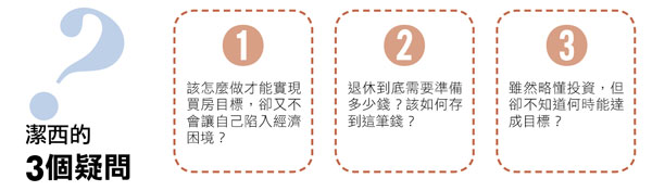 目前潔西最大的心願是買一間房子,目標鎖定在生活機能極佳的永和四號公園附近,坪數約30坪內、2房的華廈。她想知道,究竟要花多少年才能完成夢想?單身的她要如何替下半輩子做好財務規畫?