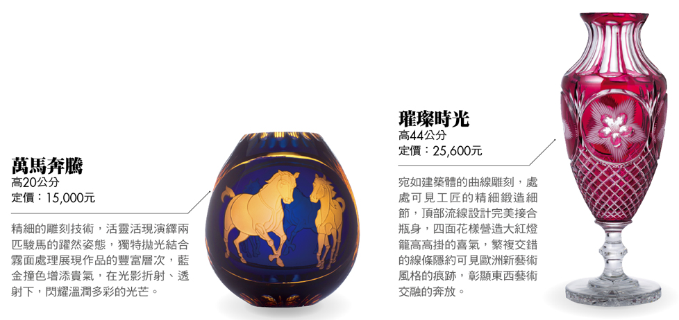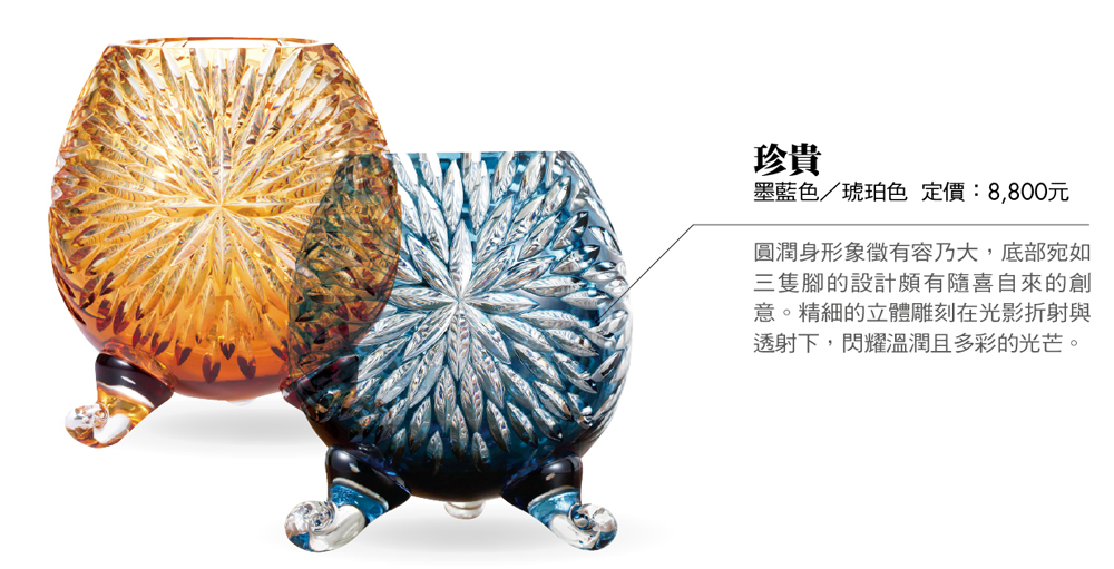 以往,高貴的水晶家飾只有王公貴族、富豪才有能力擁有,現在,任何人都可以輕鬆入荷。以經營家用精品聞名的旺代企業,旗下自有品牌LOTUS水晶藝術精品,今年春夏推出金彩系列新品,以富麗多彩、精細雕工受到矚目,價格從八千八百元到三萬三千八百元不等,對水晶愛好者來說很容易入手。