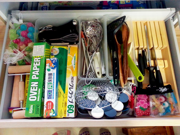 如果還有更下層的抽屜或櫥櫃,也可以放些雜貨類,例如塑膠袋、塑膠用品、保鮮膜、鋁箔紙等(上圖)。