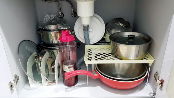 洗碗槽上方的空間可以放一些不會很重的機器,例如果汁機、食物調理機等,這類機器有許多配件,最好用籃子裝好,拿取較為方便。而洗碗槽下方的空間較為潮濕,可以放清潔劑用品、備用空瓶罐或鍋具等物品(上圖);千萬不要放果汁機等有刀片的機器,容易生鏽,保鮮盒也不宜,因為容易吸收潮濕氣息。
