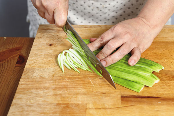 ➋ 絲瓜切成4等份,橫刀剖皮,並將剖下的絲瓜皮堆疊起來,斜切成絲。絲瓜白則留存起來他用,這兒僅用絲瓜皮,也就是絲瓜青。