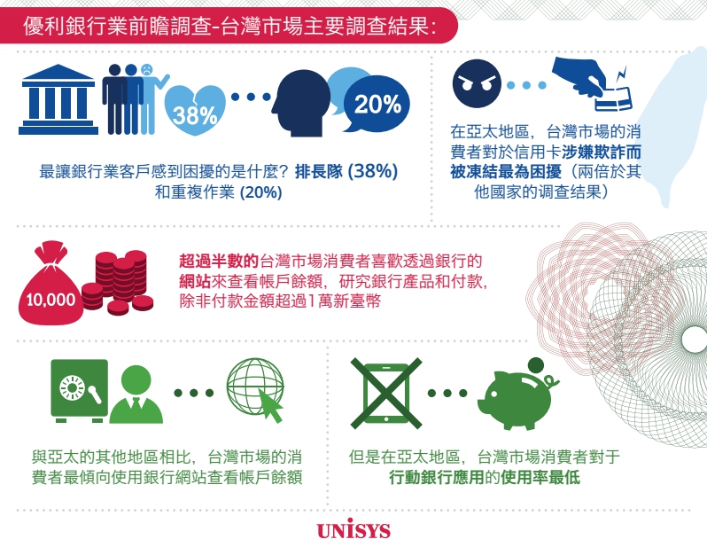 優利(Unisys)研究發現:相較於網路或行動通路,台灣消費者偏好至分行處理業務比例居亞太區之冠,其中於分行中大排長龍最使消費者感到困擾。