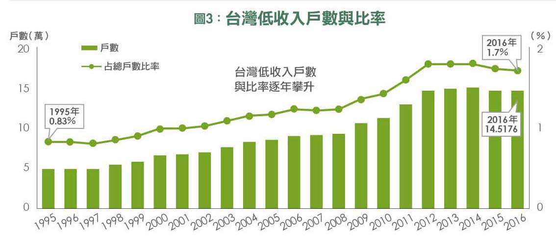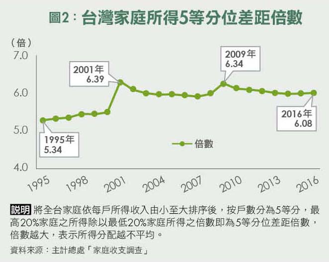 另外,自1995年起台灣家庭所得差距倍數急速惡化,20年來由5.34倍一路攀升至2016年的6.08倍(圖2),產業外移導致勞工薪資壓縮而企業主財富卻不斷增加,逐漸使得M型社會在台灣形成。
