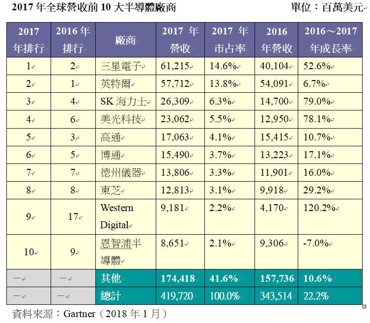 國際研究暨顧問機構Gartner初步統計結果顯示,2017年全球半導體總營收為4,197億美元,較2016年成長22.2%,其中,三星電子(Samsung)首度取代英特爾(Intel)成為全球半導體龍頭,這也是1992 年以來英特爾首次讓出冠軍寶座。