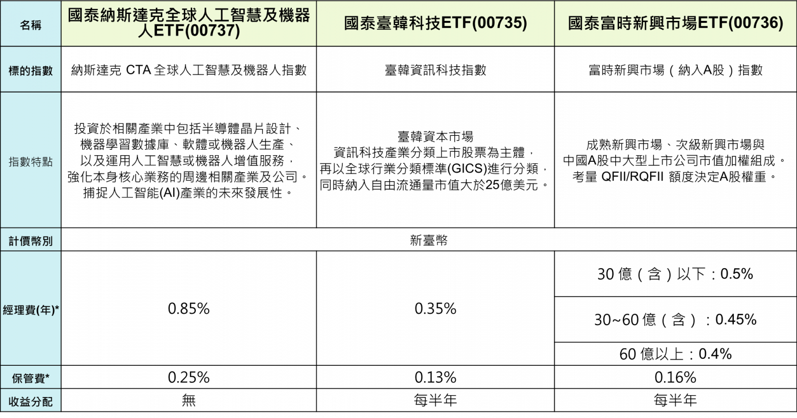國泰投信瞄準AI+Robo的「智慧型商機」的大未來,推出國泰趨勢ETF傘型基金,包括連結最純正的AI投資標的指數的「國泰納斯達克全球人工智慧及機器人ETF」(00737)、投資科技趨勢軟硬體推手的臺韓指數的「國泰臺韓科技ETF」(00735),以及供應高端科技所需原料及消費商機的「國泰富時新興市場ETF」(00736),國泰投信將於5月21日至23日募集,並預計於6月11日上市,讓投資人在台灣就能輕鬆參與AI新科技商機。