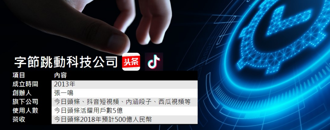 今日頭條是一家數據挖掘引擎公司,母公司為字節跳動,主要提供客戶數據服務,由張一鳴於2012年創建,近日爆紅的抖音App,母公司也為字節跳動。另外字節跳動旗下產品布局,除了以流量服務為主的今日頭條外,線上教學、遊戲、Fintech領域也成為這次IPO提升其上市估值的原因之一。