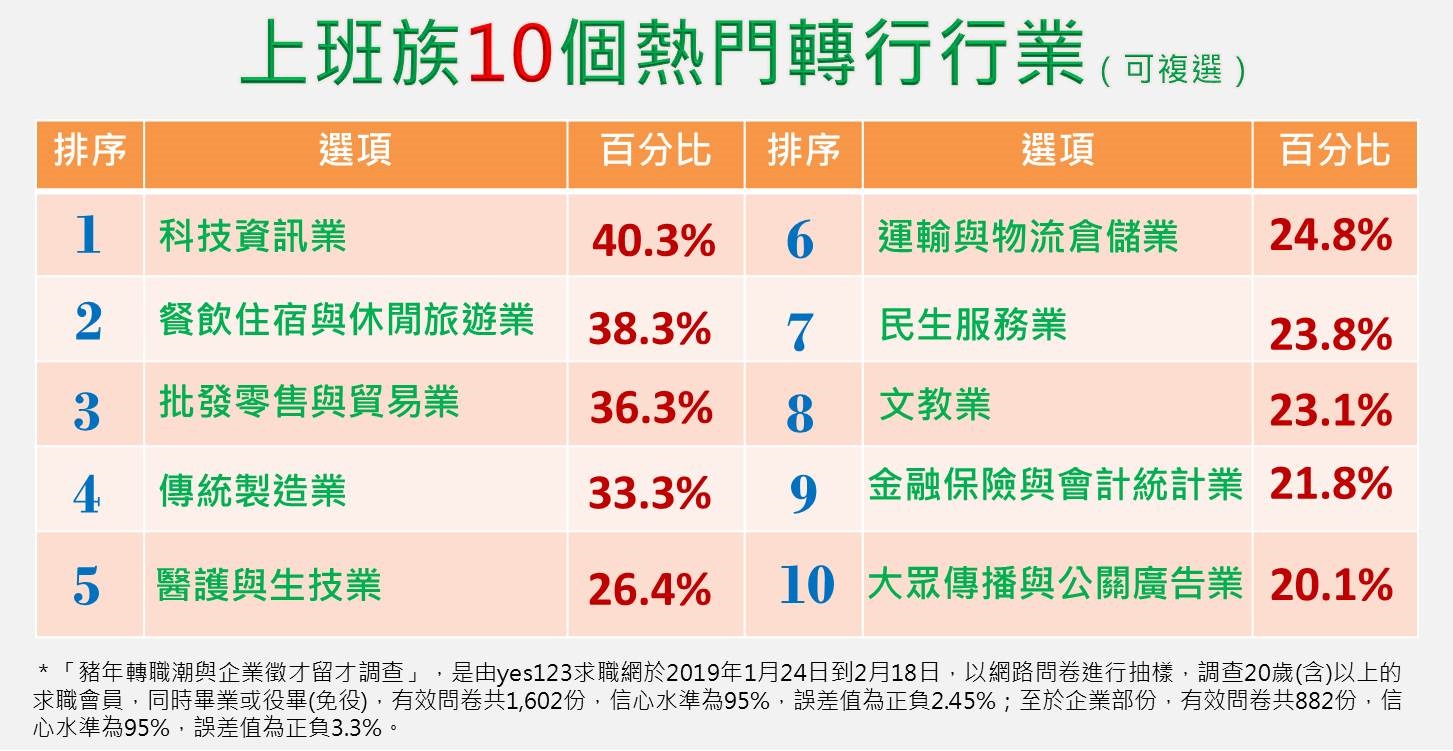 在年後跳槽族當中,又有60.4%透露,「會想轉行」;其中「最熱門」的轉行行業,在可複選情況下,前5名分別為:「科技資訊業」(40.3%)、「餐飲住宿與休閒旅遊業」(38.3%)、「批發零售與貿易業」(36.3%),以及「傳統製造業」(33.3%)、「醫護與生技業」(26.4%)。