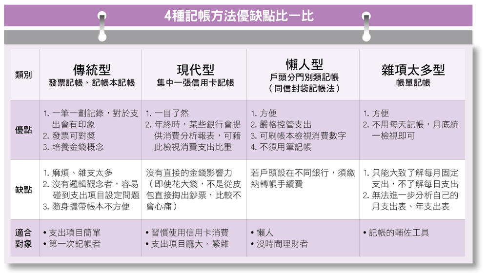 像岑永康夫婦的記帳方法,就是無論大小數字,都用信用卡消費,讓信用卡帳單成為家庭消費支出明細,還能向銀行申請帳單分析表。富蘭克林投顧副總羅尤美則是預先設定每月月結餘目標,勤於查詢銀行帳戶和皮包的鈔票數字,若今天不小心花了較大筆的錢,之後就會嘗試從別的地方省下來,保持一定的月結餘。 記帳方法有很多種,以下提供4種記帳方法的優缺點,作為參考。本文摘錄自《簡單變有錢專刊》